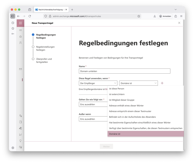 - Diese Regel anwenden, wenn → Der Empfänger → Domäne ist (deinedomain.com)