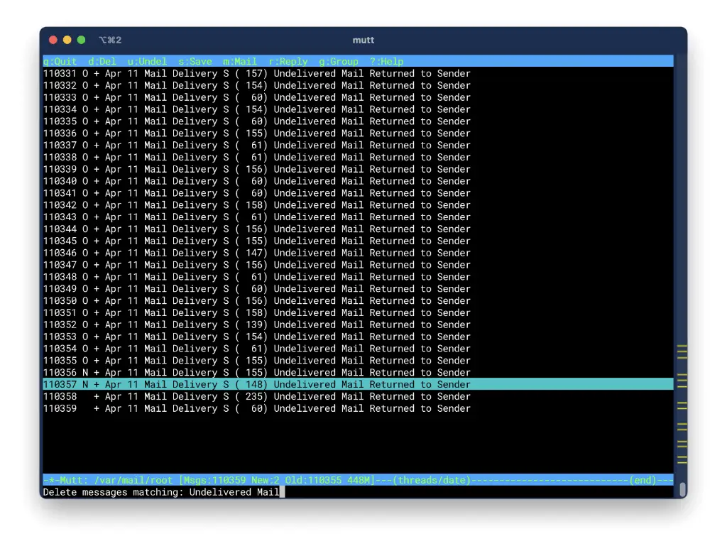 Wie man der obigen Abbildung entnehmen kann, sind da viele Mails, die ich gerne löschen möchte. Aber der Ansatz, dass ich mich durch jede Mail mit d durchklicke und diese als „zu löschend“ markiere, ist Keiner.